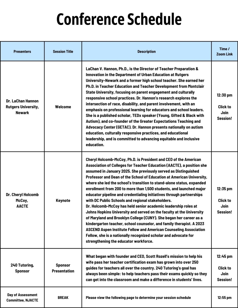 The New Jersey Association of Colleges for Teacher Education (NJACTE) is pleased to present its 8th annual virtual Day of Assessment Conference, with keynote address by Dr. Cheryl Holcomb-McCoy, President and CEO of the American Association of Colleges for Teacher Education (AACTE).