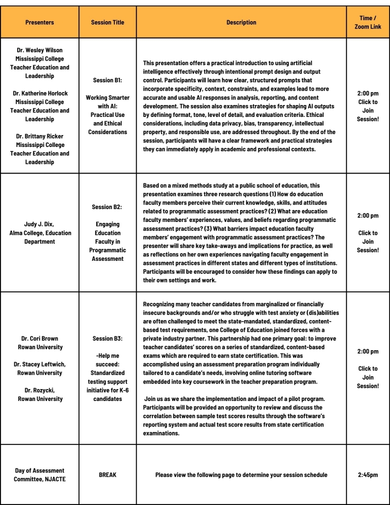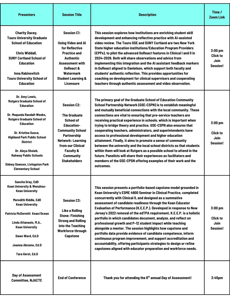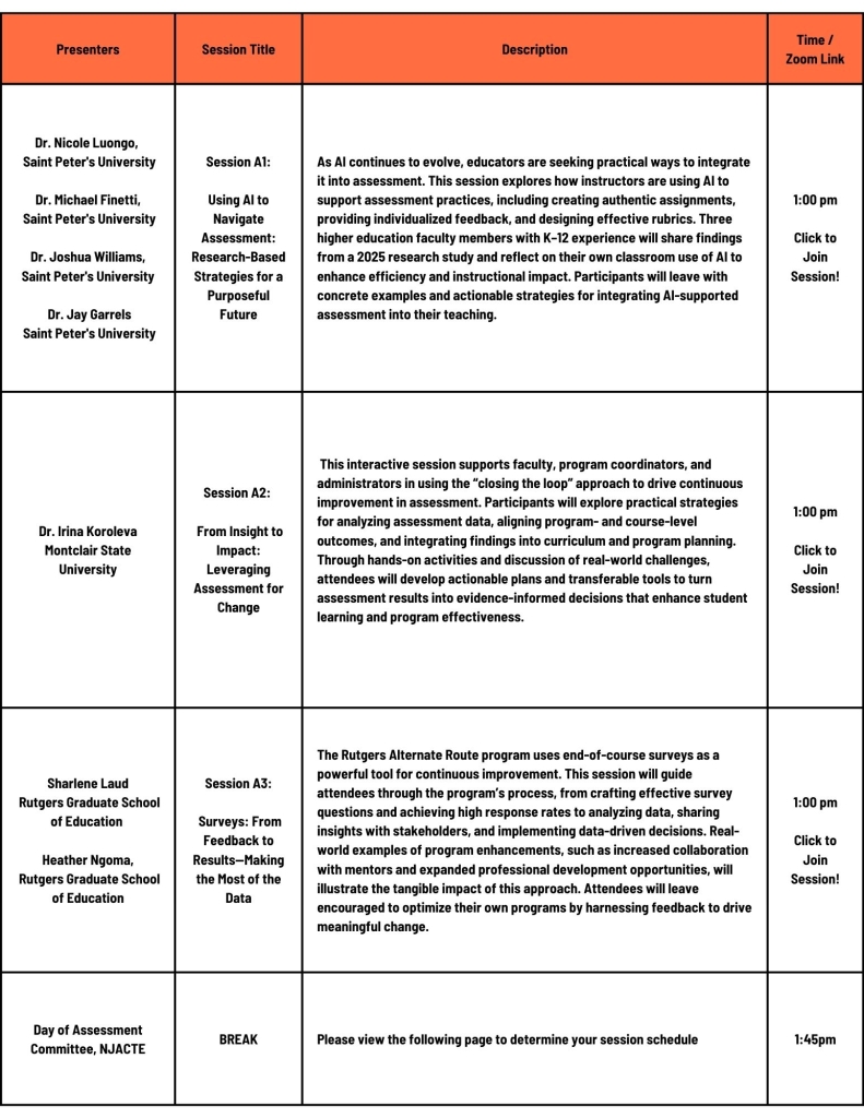 About the Conference. The NJACTE Day of Assessment conference is part of our overall efforts to increase chapter engagement providing a valuable opportunity for faculty, staff, administrators, and students to come together and learn from each other on various aspects of assessment in educator preparation. The Day of Assessment began as an in-person event, and in recent years it has shifted to a virtual format that has enabled participation from a wider geographic area across the mid-Atlantic region. NJACTE welcomes attendees from all states to join in the networking, collaboration, and shared learning. Each year the conference features a keynote or panel discussion, followed by concurrent presentations by our members and other colleagues in the field.