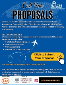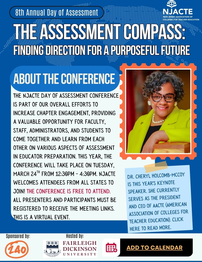 The New Jersey Association of Colleges for Teacher Education (NJACTE) is pleased to present its 8th annual virtual Day of Assessment Conference, with keynote address by Dr. Cheryl Holcomb-McCoy, President and CEO of the American Association of Colleges for Teacher Education (AACTE). The Call for Proposals is now open through January 15, 2026.