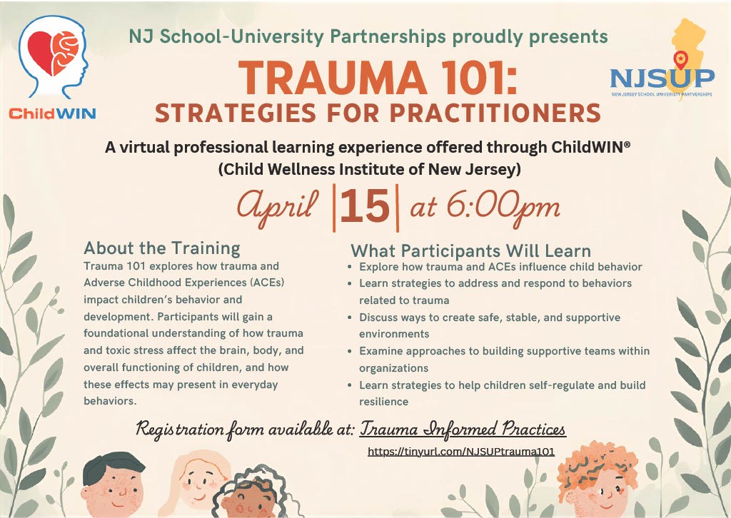 NJSUP is collaborating with ChildWIN to present the event TRAUMA 101: Strategies for Practitioners. This event is free and open to anyone who registers. REGISTER TODAY